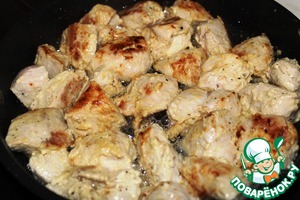 Обжариваем куски индейки в растительном масле, на хорошо разогретой сковороде, со всех сторон.