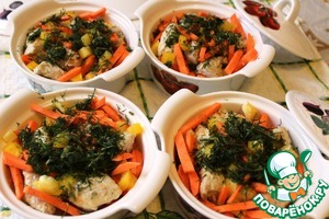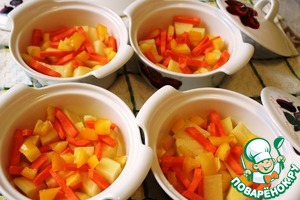 На дно порционных горшочков для запекания выкладываем овощи.