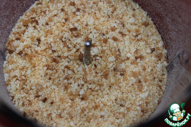 Далее готовлю сухарики. Два ломтика белого батона подсушиваю в микроволновке под грилем, затем разламываю на кусочки и перемалываю блендером в крупную крошку.