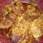 Открываем крышку. Убираем перчик и перемешиваем содержимое казана, тушим еще 10-20 минут, помешивая. Забыла сфотографировать после последнего тушения. Расскажу, что происходит. Получается мясо, тающее во рту и очень вкусный соус светло-коричневого цвета. Лук в нем практически не чувствуется.
