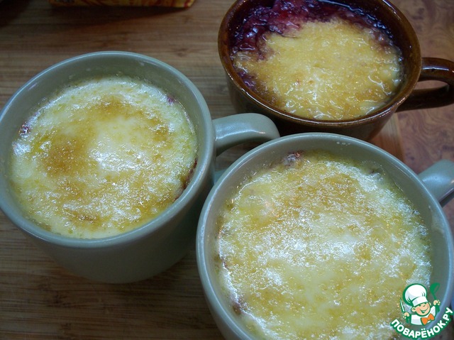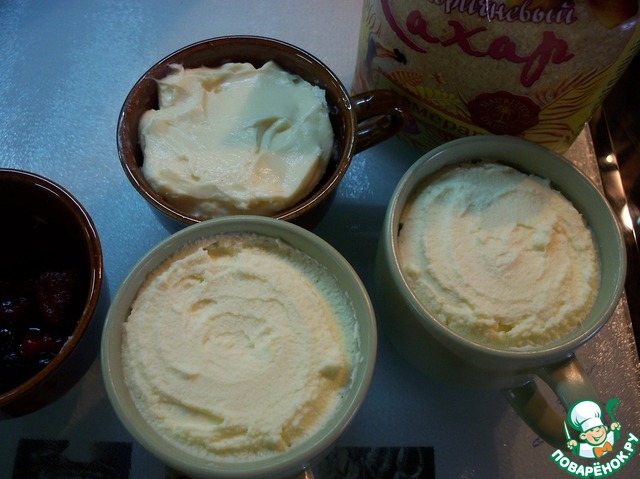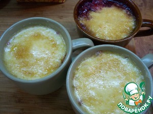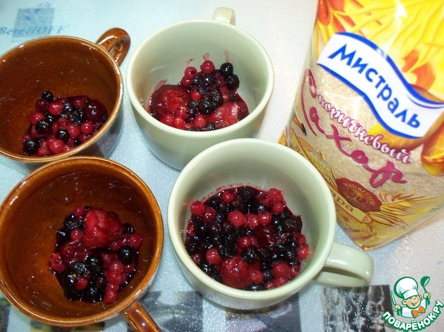 Ягоды разморозить (у меня микс: смородина черная и красная, клубника, вишня) при комнатной температуре, лишнюю жидкость слить. Разложить по чашкам. Этот десерт хорошо смотрится в чайных чашках. Готовить можно в них же, если они керамические, а не фарфоровые)))