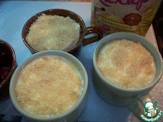 Сверху на сыр высыпать по 1-й столовой ложке коричневого сахара. Поставить в духовку при температуре 200 градусов. Важно, чтобы десерт подпекся сверху. Готовить, пока сырная смесь не запузырится.