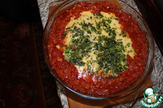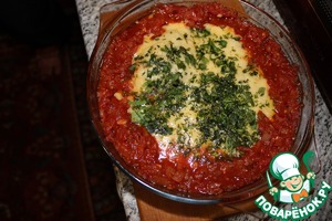 В смазанную форму укладываете 1 блин. Смазываете его 1/2 начинки № 1, следующий блин - 1/2 начинки № 2 и так далее, пока блины и начинка не закончатся. Остаток сырного соуса греем с 1/5-1/4 стакана молока, размешиваем и заливаем нашу башенку. Посыпаем тертым сыром. И вот здесь я оплошала. Стала читать рецепт, выяснять - куда нужен томатный соус, ругать переводчиков. И в итоге самостоятельно выложила томатный соус на края башенки и посыпала петрушкой. Потом смотрю, в конце рецепта - подавать с томатным соусом, посыпав петрушкой.
