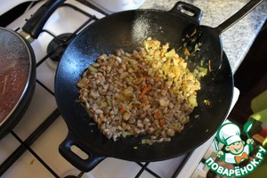 Начинка из курицы. Обжариваем курочку в сливочном масле. с зеленым луком, солим, приправляем, вливаем вермут и увариваем его. Вводим 1/2 стакана сырного соуса.