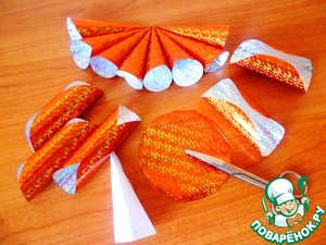 Из плотной фольгированной бумаги вырезаем кружочки диаметром 10см. Для нашего количества продуктов надо вырезать 15 кружков. Сворачиваем их конусом и кончик закрепляем скотчем. Получились своеобразные формочки для конфет.