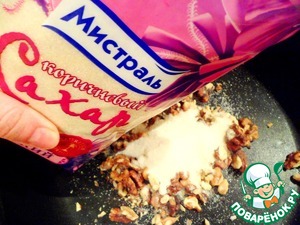 Орехи с сахаром поставить на сковороде нагреваться на огонь. Следить, чтобы карамель только зазолотилась, т. к. если перекалить, то конфеты будут горчить!