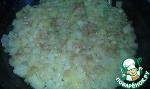 Фарш любой (в моем случае это была "колбаса домашняя", приготовленная по рецепту с сайта) добавить к луку в сковороду. продолжать обжаривать на медленном огне.