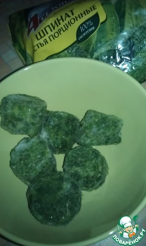 Шпинат (у меня замороженный из пакета) нарезать кубиками и добавить в сковороду. Посолить, поперчить по вкусу. Не забываем перемешивать.