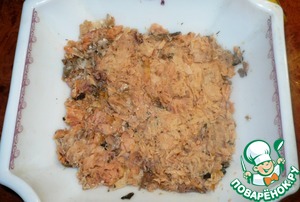 Горбушу вытащить из рассола, удалить хребет и другие мелкие кости (если попадается) и размять вилкой.