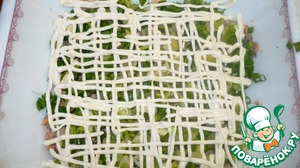 Сверху посыпать рубленным луком и сделать сеточку майонезом.