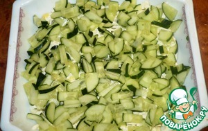 Дальше слой рубленный огурец. (резать можете как удобно, хотите кубиками или соломкой). Слой майонеза. Солить не нужно, иначе овощи быстро стекут и будет не очень эстетично. На вкус, впрочем, не влияет.