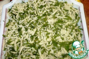 Сыр натереть, смешать с рубленной зеленью укропа и кинзы. Уложить на слой с огурцами. Сеточка майонеза.