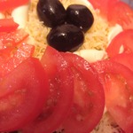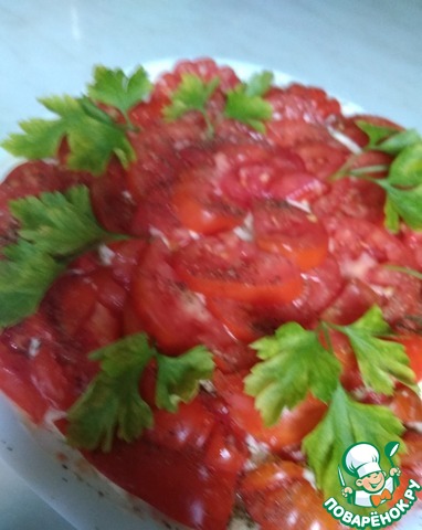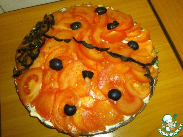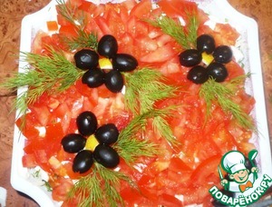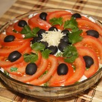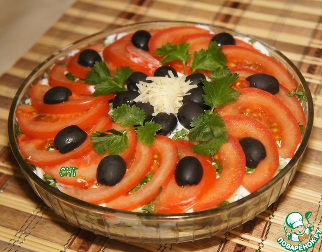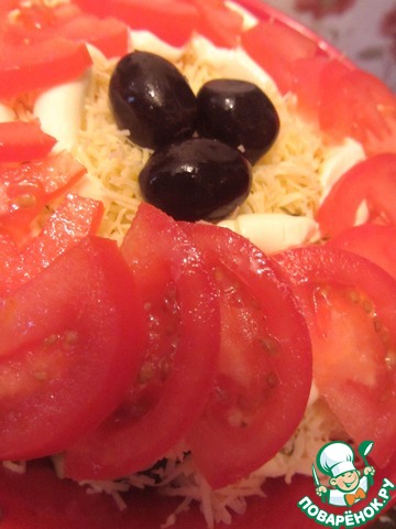 Последний слой помидор. Его порезать и положить на несколько минут в дуршлаг, чтобы лишний сок стек. Затем перекладываем в салатник и украшаем маслинами.