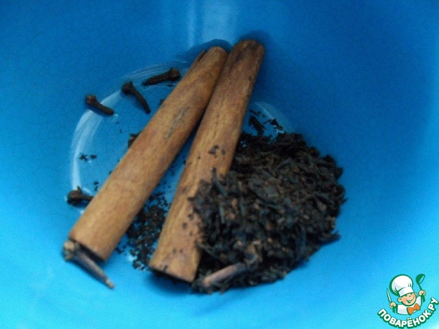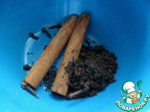 В чашке или чайнике заварить 100 мл кипятка чай с палочками корицы и гвоздичками (зерен гвоздики и палочек корицы можно добавить и больше).
