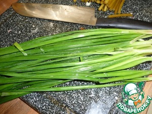 Чесночные дудки (стрелки) разрезать на три части. Если готовить лагман летом, лучше всего использовать свежие.