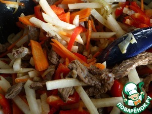 Затем добавляем морковь, редьку. Обжариваем и мешаем.