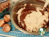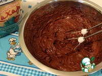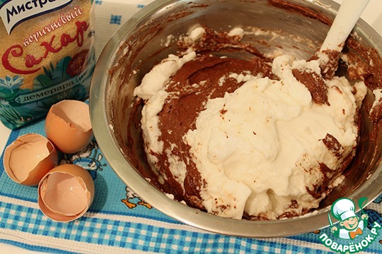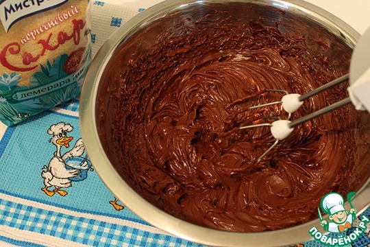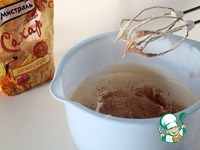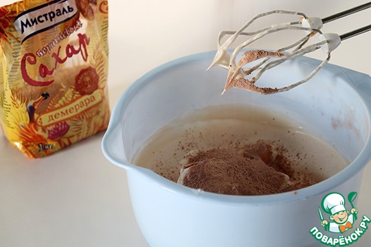 После того, как добавили весь сахар, не прекращая взбивание, постепенно всыпаем смесь какао и сахарной пудры.