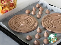 На противень, покрытый бумагой для выпечки, при помощи кондитерского мешка отсадить по спирали два круга равного диаметра. Из оставшейся массы отсадить маленькие меренги. Коржи печь примерно 1 час, маленькие меренги достать раньше минут на 10. Ориентируйтесь по своей духовке, время может отличаться. Коржи охладить на решётке, после чего снять с бумаги. В обязательном порядке попробовать маленькую безешку, удивительно вкусно! И шоколад, и карамельный привкус Демерары... мммм... Всего одну безешку, напоминаю! )))