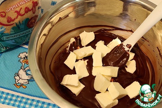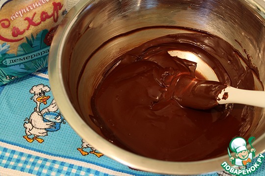 Шоколад разломать на кусочки, растопить на водяной бане, постоянно помешивая. Вода в кастрюле, на которой вы будете нагревать шоколад, не должна бурно кипеть. Обычно я довожу воду до кипения, затем уменьшаю огонь до минимума и ставлю миску с шоколадом.