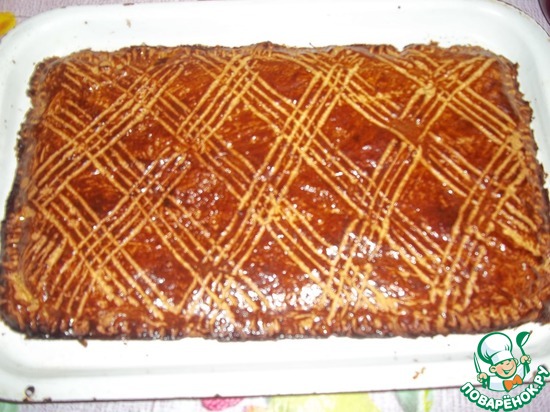 Раскатываем также вторую часть теста. Аккуратно переносим ее на противень и накрываем первую половину. Бумагу удаляем