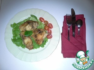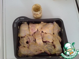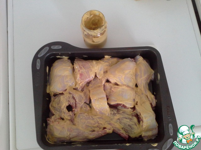 Разогреваем духовку до 180 º. Кладем его на противень или форму для запекания, намазываем его только с одной стороны горчицей (это важно). Не солим, не перчим!