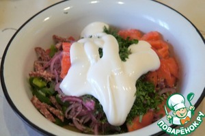 Вот интересно: сытный и в то же время нетяжелый салатик. Ароматный за счет салями, остренький за счет маринованного лука, свеженький за счет сочного болгарского перца и листьев зеленого салата.