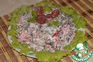 Нашинковать соломкой огурец и 5-6 ломтиков салями.