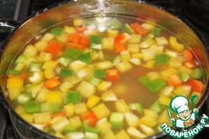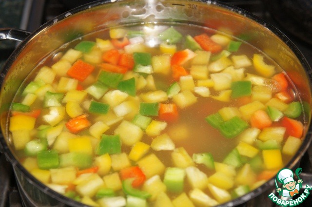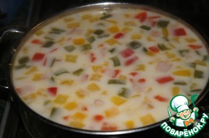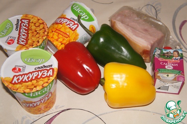 Добавить бекон, перцы и кукурузу, довести до кипения и варить на маленьком огне минут 10, до готовности овощей.