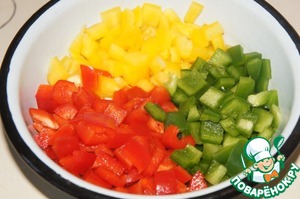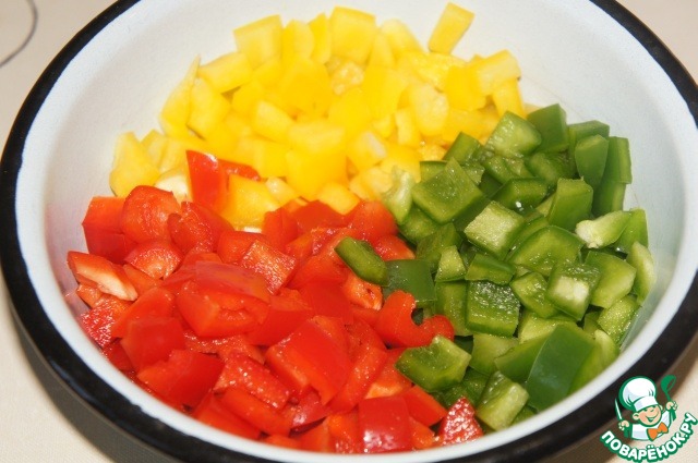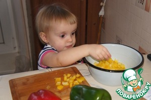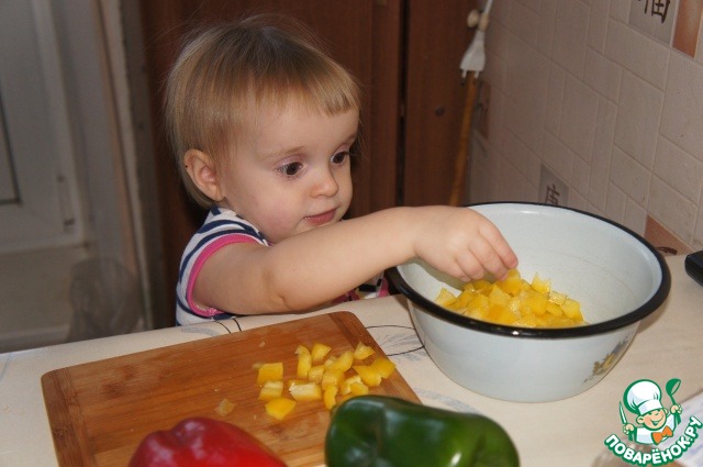 Вот у меня уже и вторая помощница подрастает. Старается, помогает бабушке... правда, пока больше себе в ротик отправляет, но все равно смотреть на нее одно удовольствие. Я резала перец кубиками, а она складывала его в миску.