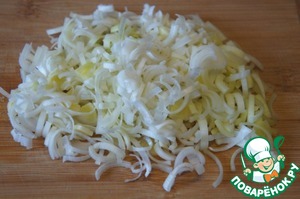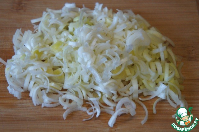 Я решила добавить в суп лука-порея, мне кажется, что это очень по-американски. Нарезала белую и светло-зеленую часть тонкими полуколечками.
