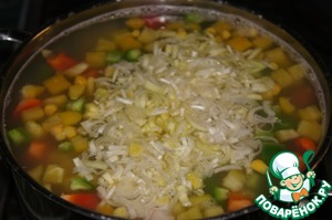 Свежую кукурузу у нас на Севере, тем более, зимой, достать невозможно, как вы понимаете, поэтому я взяла 3 стакана по 200 г замороженной кукурузы, но в суп у меня ушло только 2 стакана.