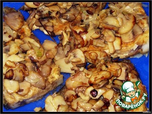 Положить рыбу в форму, выложить сверху грибы, залить приготовленным соусом, посыпать тертым сыром и запекать в духовом шкафу около 25-30 минут.