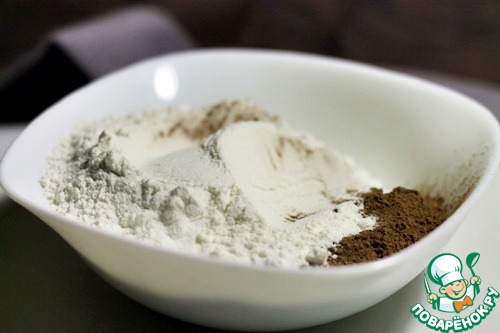 Муку смешать с разрыхлителем, какао и щепоткой соли.