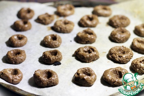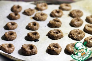 Слегка влажными руками сформировать шарики, выложить их на бумагу для запекания на определённом расстоянии друг от друга, во время выпечки они подрастут)) Затем пальцем сделать углубления посередине и отправить запекаться не около 10 минут при 180 град.