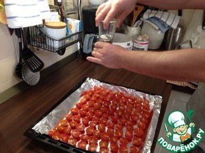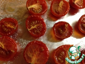 Берем ножницы (кухонные) и наносим разрезы. Насквозь тесто разрезать не надо!!! К этому времени помидоры в духовке уже должны провялиться. Вытаскиваем их, даем охладиться.