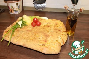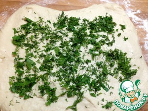 Тесто выкладываем на слегка подпыленную мукой поверхность и распрямляем руками в прямоугольник размерами примерно 35 х 25 см. Рассыпаем по поверхности зелень.