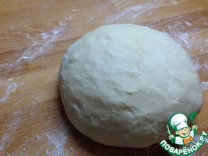 На слегка подпыленную мукой поверхность выкладываем тесто, распрямляем его под размер противня (в котором будем выпекать), перекладываем тесто на заранее подготовленную бумагу для выпечки (либо застеленный ею противень).