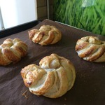 7. Выкладываем получившиеся булочки-слоечки на противень, застеленный пекарской бумагой или силиконовым ковриком, накрыть полотенцем, поставить на расстойку в теплое место на 40 минут.