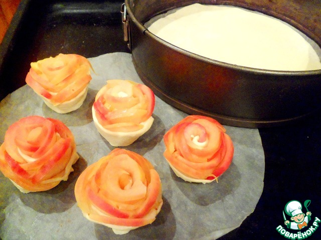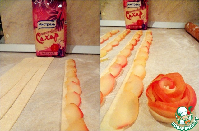 Разрезать тесто на 5 полосок шириной 2 см и разложить на них с небольшим нахлестом ломтики яблок, так чтобы краешки с кожурой немного выступали над тестом, каждую полоску аккуратно скручиваем в рулет и вуаля - получилась розочка.