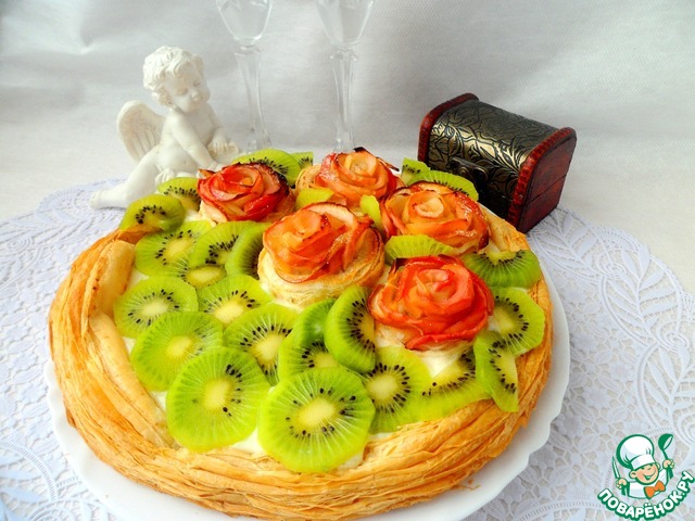 Моя семья очень любит выпечку из слоеного теста. Готовила много разнообразных и интересных рецептов, но именно к этому варианту выпечки постоянно возвращаюсь и готовлю с удовольствием, ведь здесь можно варьировать любой крем и любые фрукты по вашему желанию. Получается очень нежный пирог с заварным кремом, фруктами и розами из яблок, запеченных в тесте.
