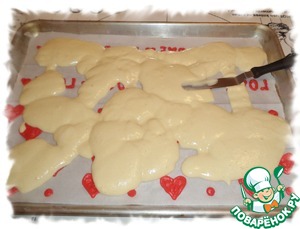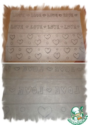 Подготавливаем бумагу для выпечки по размеру противня. В зависимости от ширины делим бумагу на полоски. Ширина полоски - это высота вашего торта, поэтому, чем уже полоска, тем торт будет ниже и, соответственно, чем шире полоска, тем торт будет выше. У меня полоски шириной 7,3 см. В центре каждой полоски простым карандашом пишем слова и рисуем сердечки (или пишем и рисуем, что хотим). Переворачиваем бумагу рисунком вниз и укладываем на противень.