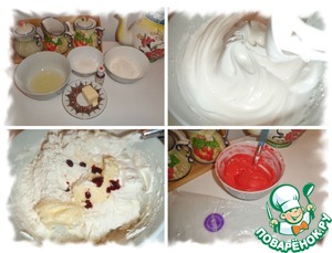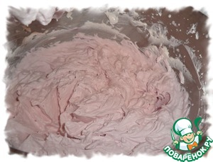 Пока корж остывает, делаем крем. Вишню предварительно разморозить. Сливки взбиваем до плотного состояния, продолжая взбивать, добавляем крем из маршмеллоу и 3 ст. л. сока от вишни для цвета.