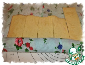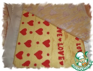 Kаждую полоску переворачиваем на слегка смоченое водой полотенце рисунком вниз, укладывая полосочки плотно друг к другу. Сворачиваем полотенце вместе с бисквитом и оставляем так до полного остывания.