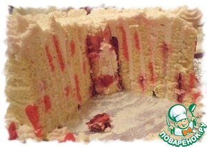 И тут (как позже выяснилось) я, по-видимому, зашлась так, что забыла сделать фотографии следующего шага. Но это очень просто и легко. Разворачиваем остывший корж, смазываем полоски кремом и сверху выкладываем вишню.