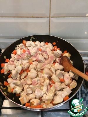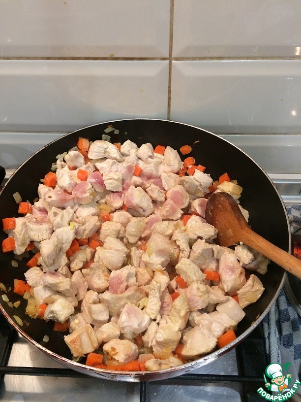 Обжариваем лук и морковь. Добавляем индюшатину и солим, перчим по вкусу