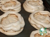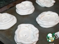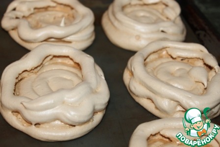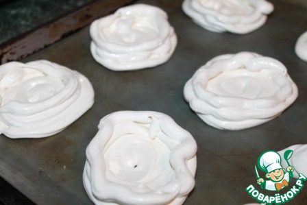 На застелённый бумагой или силиконовым ковриком противень выкладываем меренги, я это делала с помощью шприца, можно и ложкой, главное, сделать небольшое углубление посередине.