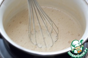 Снимите карамель с огня и тоненькой струйкой влейте в нее горячие сливки. Вливайте сливки небольшими порциями, при этом непрерывно мешая венчиком.