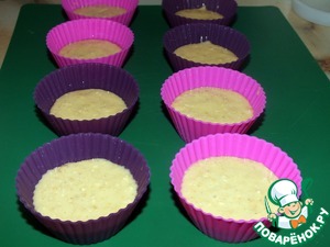 Заполнить тестом смазанные формочки для кексов на 2/3. Выпекать в горячей духовке 15-20 минут при t-200*. У меня получилось 14 шт.