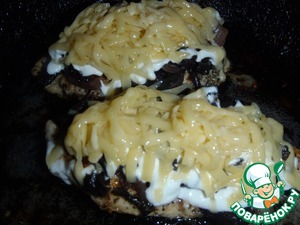 Далее на каждый кусочек филе кладем по половине обжаренных грибочков, поливаем это все сметаной или йогуртом, по необходимости присаливаем и посыпаем тертым сыром и зеленью. -