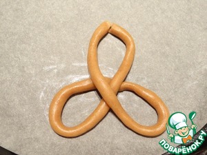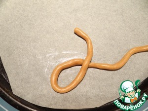 Противень сразу застилаю пергаментом, т. к. печенье надо формовать сразу на нем. Отламываю небольшой кусочек теста и начинаю формовать печенье (все тесто доставать из холодильника сразу не надо, т. к. при нагревании из него трудно будет формовать печенье). Из теста быстро раскатываю с помощью ладоней длинный жгут (диаметром около 0,8 мм), делаю петлю, как на фото.